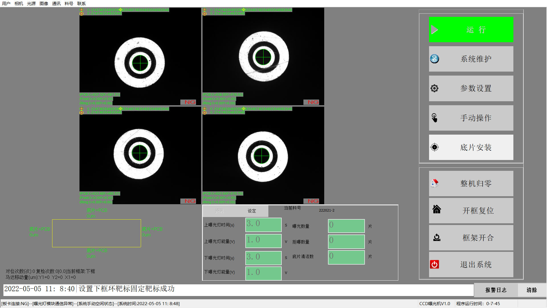 曝(pu)光機(ji)在實施圖(tu)像(xiang)轉移(yi)之前(qian)需(xu)要將菲(fei)(fei)林(lin)上的Mark點(一般(ban)是(shi)空(kong)心(xin)圓環)和(he)PCB板(ban)上的Mark點(一般(ban)是(shi)實心(xin)圓點)通過視(shi)覺對位套(tao)好,精(jing)度一般(ban)是(shi)1mil~2mil。視(shi)覺部分(fen)使用四(si)個相(xiang)機(ji),每(mei)個相(xiang)機(ji)負責(ze)相(xiang)應視(shi)野范圍內(nei)的菲(fei)(fei)林(lin)Mark和(he)PCB板(ban)Mark點重(zhong)合
