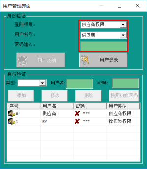 ② 用戶管理界面,輸入供應商權限密碼:“310525”,點擊“用戶登陸”,進入軟件管理權。Fig.3 用戶管理界面
