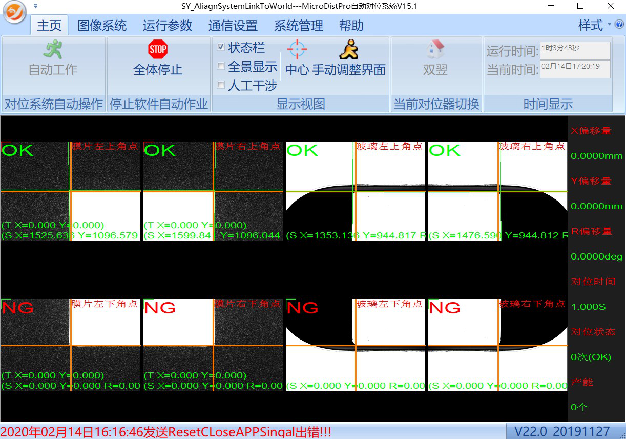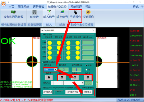 ◆ 設置待機位之前需要啟動復位進行平臺回零,回零完成后點擊“軸操作/IO 監控”->“手動操作”彈出軸操作界面,選擇 X1 軸,填寫點動距離,通過手動點擊正反轉操控 X1 軸到限位中間位置,最后點“保存點位”。同理設定 X2 軸和 Y 軸的待機位置,如此便完成了對位平臺待機位的設定。
