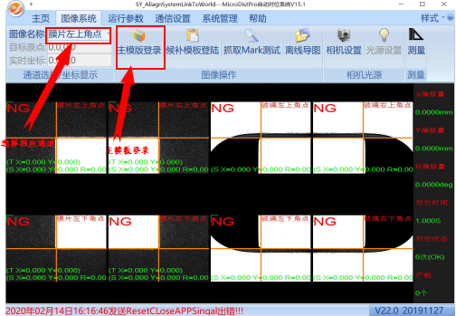 ? Step1:如圖 7 所示,通(tong)過“通(tong)道(dao)(dao)名稱”處選(xuan)擇我們要(yao)進行模板(ban)學(xue)習(xi)的(de)通(tong)道(dao)(dao):“膜(mo)片(pian)左上(shang)角點”,然后點擊“主模板(ban)登錄”進行圖像的(de)模板(ban)學(xue)習(xi)。