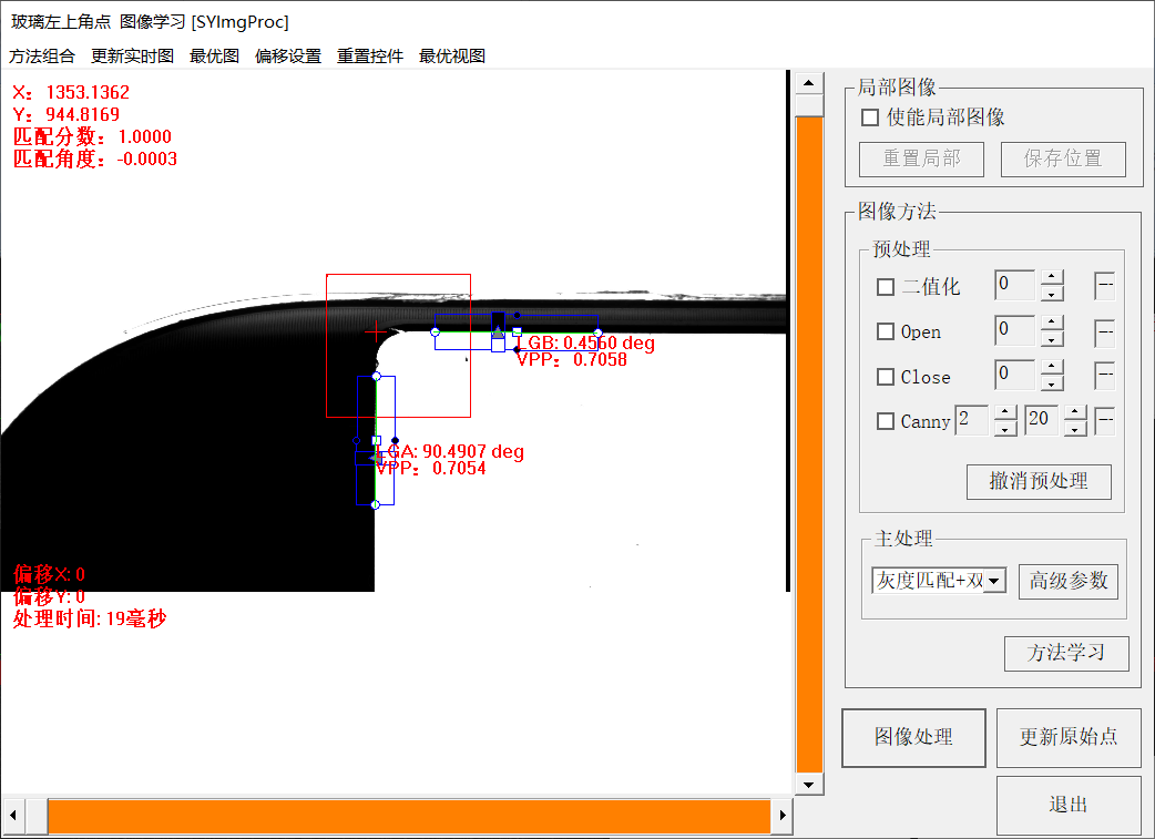 ? Step2:如圖(tu) 8 所示(shi),下拉重新(xin)選(xuan)擇“灰(hui)度匹(pi)配+雙直(zhi)線(xian)(xian)(xian)”,黃(huang)色(se)(se)的模(mo)(mo)板(ban)(ban)框工(gong)具和(he)藍(lan)色(se)(se)的直(zhi)線(xian)(xian)(xian)工(gong)具則會顯示(shi)出來(lai),通過(guo)拖拽調整(zheng)先使兩個直(zhi)線(xian)(xian)(xian)工(gong)具的中線(xian)(xian)(xian)分別(bie)與(yu)產品(pin)的水平邊(bian)和(he)垂直(zhi)邊(bian)的邊(bian)緣相接,然后調整(zheng)模(mo)(mo)板(ban)(ban)框位置和(he)大小到合適(shi),再點擊“方法學習”,則學習記錄當(dang)前的模(mo)(mo)板(ban)(ban)。注意直(zhi)線(xian)(xian)(xian)工(gong)具的極性和(he)找邊(bian)方向。