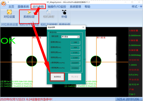 ◆ 系統全體停止的狀態下點擊“運行參數”->“系統標定”,彈出標定界面后,點擊“啟動標定”即可開始標定,系統提示標定完成即完成標定。