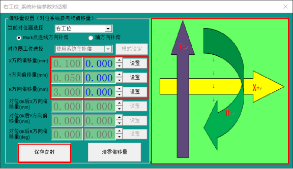 ◆ 根據補償方向圖示,在右側對應的方向補償寫入補償數值后,點擊“設置”累加到左側的總補償參數中。設置完補償參數退出前必須要點擊“保存參數”,補償才能生效。