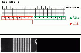 設計目的(de)與上(shang)面的(de)雙輸出(chu)是(shi)大致相同的(de), 主要差異(yi)在于它是(shi)將(jiang)整(zheng)個(ge)線性CCD的(de)每個(ge)光電二極管在感(gan)光后(hou)分成前半(ban)段(duan)及后(hou)半(ban)段(duan),將(jiang)光轉成電荷訊號(hao)分成兩(liang)組將(jiang)數據傳(chuan)遞出(chu)去。