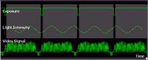 ① 下圖所示為(wei)一般區域掃描 (Area-scan) 攝影機 (取像(xiang)速度(du)大(da)約(yue)在(zai)30fps) 在(zai)一般室(shi)內日(ri)光燈(deng)源 (交(jiao)流電(dian)源, 頻(pin)率(lv)為(wei)60Hz) 下的示波(bo)器取像(xiang)訊號。日(ri)光燈(deng)的閃(shan)爍頻(pin)率(lv)對這樣的攝影機的曝光時間而言, 并不(bu)會有(you)太大(da)影響, 使用(yong)者仍然可以(yi)取得亮度(du)均勻的影像(xiang)。