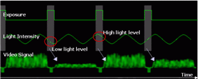 ② 下圖所示為將區域掃(sao)描攝影(ying)(ying)機的(de)(de)(de)快門調快, 這也就會造(zao)成曝(pu)光時間變短, 這時候(hou)攝影(ying)(ying)機明(ming)顯受到日(ri)光燈的(de)(de)(de)閃爍頻率所影(ying)(ying)響, 在光線(xian)閃爍的(de)(de)(de)亮暗之間取(qu)像出來的(de)(de)(de)影(ying)(ying)像也會出現(xian)忽明(ming)忽暗的(de)(de)(de)情形(xing)。