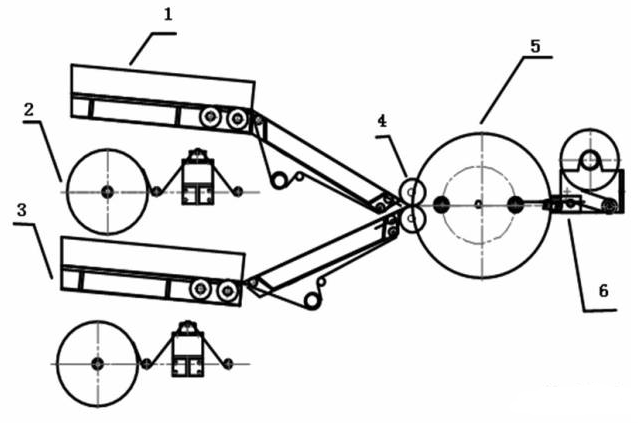 1.正(zheng)極(ji)片送(song)料機構(gou)2.隔膜放卷(juan)機構(gou)3.負極(ji)片送(song)料機構(gou)4.軋壓輥(gun)5.卷(juan)繞機構(gou)6.封貼及切斷機構(gou)