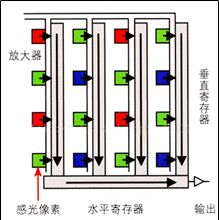 在(zai)感(gan)光(guang)(guang)像(xiang)點(dian)接(jie)受光(guang)(guang)照之后(hou)(hou),感(gan)光(guang)(guang)元(yuan)(yuan)件(jian)產生(sheng)對應的(de)(de)(de)(de)電(dian)(dian)(dian)(dian)流(liu)(liu),電(dian)(dian)(dian)(dian)流(liu)(liu)大(da)(da)小(xiao)與光(guang)(guang)強對應,因(yin)此感(gan)光(guang)(guang)元(yuan)(yuan)件(jian)直(zhi)接(jie)輸(shu)(shu)出(chu)(chu)(chu)的(de)(de)(de)(de)電(dian)(dian)(dian)(dian)信號(hao)是模(mo)擬(ni)的(de)(de)(de)(de)。在(zai)CCD傳感(gan)器(qi)(qi)(qi)中(zhong)(zhong),每一(yi)(yi)個(ge)感(gan)光(guang)(guang)元(yuan)(yuan)件(jian)都(dou)(dou)不對此作進(jin)一(yi)(yi)步的(de)(de)(de)(de)處(chu)(chu)理(li)(li),而(er)是將(jiang)它直(zhi)接(jie)輸(shu)(shu)出(chu)(chu)(chu)到垂直(zhi)寄存器(qi)(qi)(qi),傳到水平寄存器(qi)(qi)(qi)中(zhong)(zhong),最(zui)后(hou)(hou)才能形(xing)成統一(yi)(yi)的(de)(de)(de)(de)輸(shu)(shu)出(chu)(chu)(chu)。由(you)于感(gan)光(guang)(guang)元(yuan)(yuan)件(jian)生(sheng)成的(de)(de)(de)(de)電(dian)(dian)(dian)(dian)信號(hao)實在(zai)太微弱(ruo)了加上在(zai)此過(guo)程中(zhong)(zhong)會產生(sheng)大(da)(da)量電(dian)(dian)(dian)(dian)壓損耗,無法直(zhi)接(jie)進(jin)行(xing)模(mo)數(shu)(shu)轉(zhuan)換(huan)(huan)工作,因(yin)此這些輸(shu)(shu)出(chu)(chu)(chu)數(shu)(shu)據必須做(zuo)統一(yi)(yi)的(de)(de)(de)(de)放(fang)大(da)(da)處(chu)(chu)理(li)(li)—這項任(ren)務是由(you)CCD傳感(gan)器(qi)(qi)(qi)中(zhong)(zhong)的(de)(de)(de)(de)放(fang)大(da)(da)器(qi)(qi)(qi)專門負(fu)責,經放(fang)大(da)(da)器(qi)(qi)(qi)處(chu)(chu)理(li)(li)之后(hou)(hou),每個(ge)像(xiang)點(dian)的(de)(de)(de)(de)電(dian)(dian)(dian)(dian)信號(hao)強度都(dou)(dou)獲得同樣幅度的(de)(de)(de)(de)增大(da)(da);因(yin)信號(hao)只通過(guo)一(yi)(yi)個(ge)放(fang)大(da)(da)器(qi)(qi)(qi)進(jin)行(xing)放(fang)大(da)(da),所以產生(sheng)的(de)(de)(de)(de)噪點(dian)較少。但由(you)于CCD本身無法將(jiang)模(mo)擬(ni)信號(hao)直(zhi)接(jie)轉(zhuan)換(huan)(huan)為(wei)數(shu)(shu)字信號(hao),因(yin)此還需要一(yi)(yi)個(ge)專門的(de)(de)(de)(de)模(mo)數(shu)(shu)轉(zhuan)換(huan)(huan)芯(xin)片(pian)進(jin)行(xing)處(chu)(chu)理(li)(li),最(zui)終以二進(jin)制(zhi)數(shu)(shu)字圖像(xiang)矩(ju)陣(zhen)的(de)(de)(de)(de)形(xing)式輸(shu)(shu)出(chu)(chu)(chu)給(gei)專門的(de)(de)(de)(de)DSP處(chu)(chu)理(li)(li)芯(xin)片(pian)。