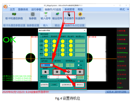 設(she)置待機(ji)位之前需要啟動復位進行(xing)平臺回零(ling),回零(ling)完成后點(dian)擊(ji)“軸(zhou)(zhou)操(cao)作/IO監控”->“手(shou)(shou)動操(cao)作”彈(dan)出軸(zhou)(zhou)操(cao)作界面,選擇X1軸(zhou)(zhou),填寫點(dian)動距離,通過手(shou)(shou)動點(dian)擊(ji)正反(fan)轉(zhuan)操(cao)控X1軸(zhou)(zhou)到限位中間位置,最(zui)后點(dian)“保存點(dian)位”。同理設(she)定(ding)X2軸(zhou)(zhou)和Y軸(zhou)(zhou)的(de)待機(ji)位置,如此便(bian)完成了對位平臺待機(ji)位的(de)設(she)定(ding)。