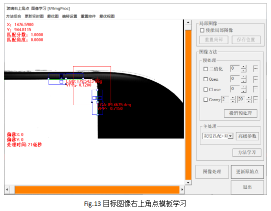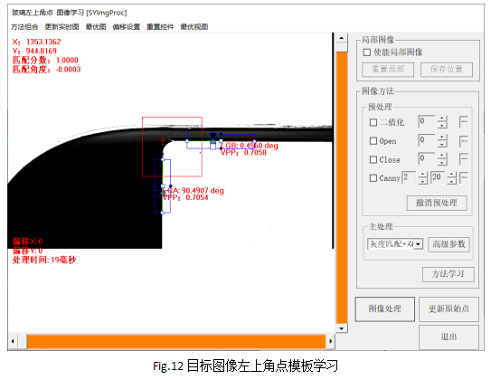 Step2:如(ru)圖8所示(shi),下拉重新(xin)選擇“灰度匹配+雙(shuang)直線(xian)(xian)”,黃色的模板框工具和藍色的直線(xian)(xian)工具則會(hui)顯示(shi)出來,通(tong)過拖(tuo)拽調(diao)整先使兩個直線(xian)(xian)工具的中線(xian)(xian)分別與產品的水平(ping)邊(bian)和垂直邊(bian)的邊(bian)緣(yuan)相(xiang)接,然后調(diao)整模板框位(wei)置和大小到合適,再點(dian)擊“方法學習(xi)(xi)”,則學習(xi)(xi)記錄當前(qian)的模板。注意直線(xian)(xian)工具的極性(xing)和找邊(bian)方向。