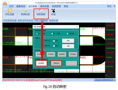 系統全體停止的狀態(tai)下(xia),打開相(xiang)機映(ying)射(she)(she)界面,放置好TP,點(dian)擊“啟動(dong)映(ying)射(she)(she)”,抓點(dian)OK完成第一次(ci)映(ying)射(she)(she)后(hou),然后(hou)重復(fu)再做第二次(ci)映(ying)射(she)(she)。再點(dian)擊“轉換測試”進行一次(ci)轉換測試。
