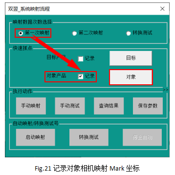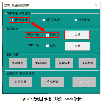 1) 系統全體停止,將TP搬運到目(mu)標(biao)相機下,打開(kai)映(ying)(ying)射界面,勾(gou)選第一次映(ying)(ying)射,再(zai)勾(gou)選目(mu)標(biao)產品“記錄”,點(dian)擊(ji)“目(mu)標(biao)”按鈕,系統會抓取Mark點(dian)的坐標(biao)。