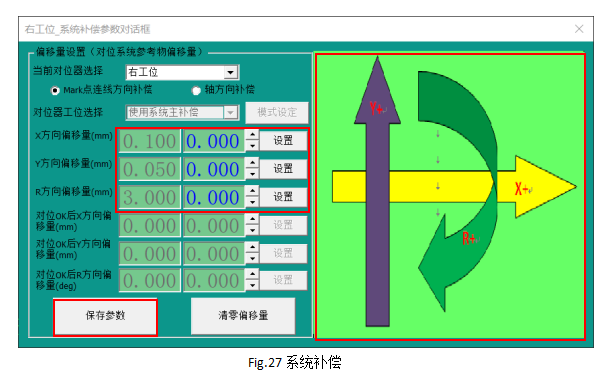 根據補償方向圖示,在右側對應的方向補償寫入補償數值后,點擊“設置”累加到左側的(de)總補償參數中。設(she)置(zhi)完補償參數退出前必(bi)須要點擊(ji)“保存參數”,補償才能生(sheng)效。