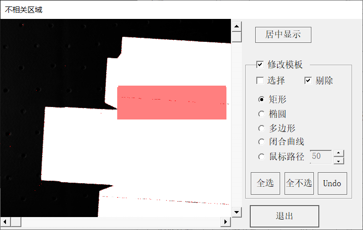 ? Step4:模(mo)(mo)(mo)板(ban)(ban)修改(gai)(gai)。點擊高級參數(shu)界面(mian)的(de)(de)模(mo)(mo)(mo)板(ban)(ban)修改(gai)(gai)則可以進(jin)入模(mo)(mo)(mo)板(ban)(ban)修改(gai)(gai)界面(mian)。模(mo)(mo)(mo)板(ban)(ban)修改(gai)(gai)的(de)(de)主要(yao)目的(de)(de)是擦(ca)除干擾(rao)區域以減(jian)小(xiao)不相關區域對圖(tu)像模(mo)(mo)(mo)板(ban)(ban)的(de)(de)影響。首先勾(gou)選(xuan)(xuan)“修改(gai)(gai)模(mo)(mo)(mo)板(ban)(ban)”,再勾(gou)選(xuan)(xuan)“剔除”,使(shi)用以下圖(tu)像工具中的(de)(de)一種進(jin)行干擾(rao)區域的(de)(de)擦(ca)除。圖(tu)中紅(hong)色區域即(ji)為擦(ca)除的(de)(de)區域。