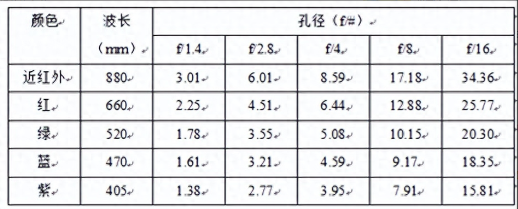下表展示了不同(tong)波長下針對(dui)不同(tong)孔徑所產生的(de)艾(ai)里斑直徑數據。