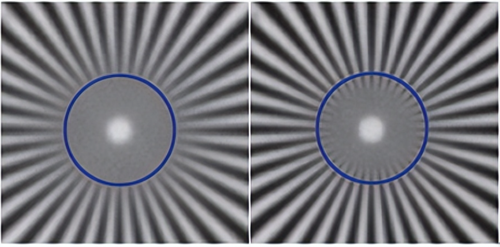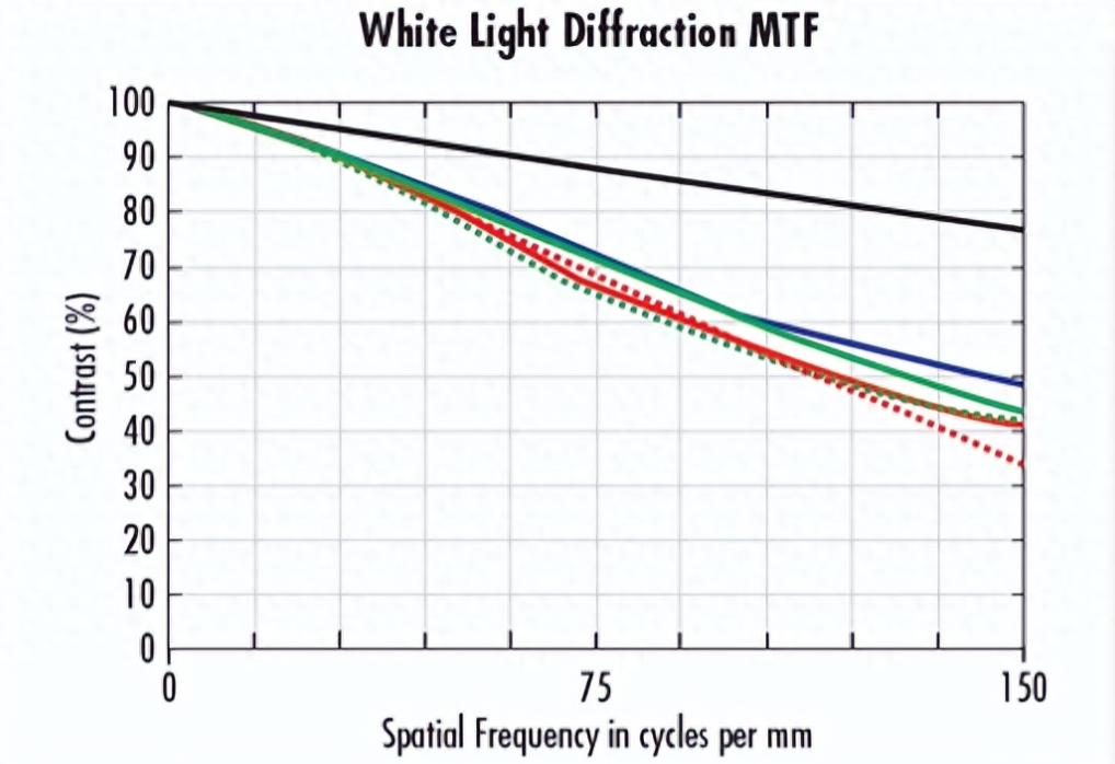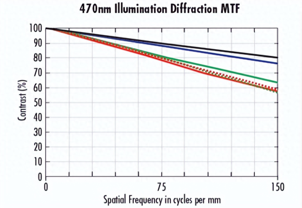對于(yu)普通(tong)鏡頭而言,使(shi)用(yong)相同(tong)的鏡頭在(zai)相同(tong)的工作距離(li)和(he)f/#下(xia)(xia),使(shi)用(yong)白(bai)光(guang)(guang)(guang)和(he)使(shi)用(yong)470nm波(bo)長(chang)的光(guang)(guang)(guang)源進行照明會(hui)有不(bu)一(yi)樣的結果。在(zai)圖中,白(bai)光(guang)(guang)(guang)下(xia)(xia)的鏡頭的奈(nai)奎斯特極限(xian)下(xia)(xia)的所有性(xing)能(neng)均不(bu)高(gao)于(yu)50%;470nm光(guang)(guang)(guang)波(bo)長(chang)情況下(xia)(xia),奈(nai)奎斯特極限(xian)下(xia)(xia)的所有性(xing)能(neng)均高(gao)于(yu)白(bai)光(guang)(guang)(guang)下(xia)(xia)的。此外,470nm下(xia)(xia)的系(xi)統中心(xin)的性(xing)能(neng)高(gao)于(yu)白(bai)光(guang)(guang)(guang)下(xia)(xia)的衍射極限(xian)。這一(yi)提升(sheng)得益于(yu)以下(xia)(xia)兩方(fang)面(mian)原因(yin):1、使(shi)用(yong)單(dan)色光(guang)(guang)(guang)消除(chu)了系(xi)統中的色像差;2、470nm波(bo)長(chang)的光(guang)(guang)(guang)是(shi)用(yong)于(yu)可見范圍成像光(guang)(guang)(guang)線的最短波(bo)長(chang)之一(yi)。所以較(jiao)短的波(bo)長(chang)能(neng)夠實現較(jiao)高(gao)的分辨率。