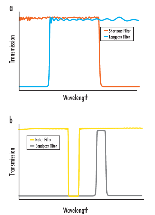 短(duan)通(tong)(tong)(tong)濾(lv)光(guang)(guang)片(pian)(pian)則相反,通(tong)(tong)(tong)過較短(duan)的(de)波(bo)長(chang)(chang),阻(zu)擋(dang)較長(chang)(chang)的(de)波(bo)長(chang)(chang)。帶(dai)通(tong)(tong)(tong)濾(lv)光(guang)(guang)片(pian)(pian)通(tong)(tong)(tong)過一(yi)個波(bo)長(chang)(chang)帶(dai),同(tong)時阻(zu)擋(dang)位于通(tong)(tong)(tong)帶(dai)之外的(de)較長(chang)(chang)和(he)較短(duan)波(bo)長(chang)(chang)。帶(dai)通(tong)(tong)(tong)濾(lv)光(guang)(guang)片(pian)(pian)的(de)反面是陷波(bo)濾(lv)光(guang)(guang)片(pian)(pian),它阻(zu)擋(dang)一(yi)段波(bo)長(chang)(chang)并通(tong)(tong)(tong)過更長(chang)(chang)和(he)更短(duan)的(de)波(bo)長(chang)(chang)。這些濾(lv)光(guang)(guang)片(pian)(pian)類型的(de)傳輸曲線形狀如圖2所(suo)示。