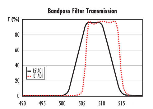 專為(wei)深度(du)阻(zu)擋(dang)(高光(guang)(guang)(guang)(guang)(guang)(guang)密度(du))和陡坡(從阻(zu)擋(dang)到透射的(de)(de)(de)急劇(ju)過(guo)渡(du))設計(ji)的(de)(de)(de)濾(lv)(lv)(lv)(lv)(lv)(lv)光(guang)(guang)(guang)(guang)(guang)(guang)片(pian)(pian)(pian)在(zai)精(jing)(jing)確(que)(que)的(de)(de)(de)光(guang)(guang)(guang)(guang)(guang)(guang)控制至關重(zhong)要(yao)(yao)的(de)(de)(de)應用(yong)(yong)(yong)中重(zhong)復使用(yong)(yong)(yong)。大(da)(da)多(duo)(duo)數(shu)機器視(shi)覺(jue)應用(yong)(yong)(yong)不需要(yao)(yao)這(zhe)(zhe)種精(jing)(jing)度(du);通常(chang),光(guang)(guang)(guang)(guang)(guang)(guang)密度(du)(OD)為(wei)4或更(geng)大(da)(da)的(de)(de)(de)任何濾(lv)(lv)(lv)(lv)(lv)(lv)光(guang)(guang)(guang)(guang)(guang)(guang)片(pian)(pian)(pian)都(dou)比(bi)(bi)要(yao)(yao)求的(de)(de)(de)更(geng)精(jing)(jing)確(que)(que)并且增(zeng)(zeng)加(jia)了(le)不必要(yao)(yao)的(de)(de)(de)成本。由于(yu)硬(ying)涂層(ceng)(ceng)濾(lv)(lv)(lv)(lv)(lv)(lv)光(guang)(guang)(guang)(guang)(guang)(guang)片(pian)(pian)(pian)利用(yong)(yong)(yong)光(guang)(guang)(guang)(guang)(guang)(guang)學干涉(she)來(lai)實(shi)現這(zhe)(zhe)種精(jing)(jing)確(que)(que)的(de)(de)(de)傳輸和抑制帶,因此在(zai)機器視(shi)覺(jue)應用(yong)(yong)(yong)中使用(yong)(yong)(yong)硬(ying)涂層(ceng)(ceng)濾(lv)(lv)(lv)(lv)(lv)(lv)光(guang)(guang)(guang)(guang)(guang)(guang)片(pian)(pian)(pian)會(hui)帶來(lai)困難。所有(you)干涉(she)濾(lv)(lv)(lv)(lv)(lv)(lv)光(guang)(guang)(guang)(guang)(guang)(guang)片(pian)(pian)(pian)都(dou)是(shi)為(wei)特(te)(te)定的(de)(de)(de)入射角(jiao)(jiao)(AOI)設計(ji)的(de)(de)(de),通常(chang)為(wei)0°,除(chu)非另有(you)特(te)(te)別指定。當用(yong)(yong)(yong)于(yu)機器視(shi)覺(jue)時,這(zhe)(zhe)些(xie)濾(lv)(lv)(lv)(lv)(lv)(lv)光(guang)(guang)(guang)(guang)(guang)(guang)片(pian)(pian)(pian)通常(chang)放置在(zai)鏡頭(tou)前面;這(zhe)(zhe)樣做使得濾(lv)(lv)(lv)(lv)(lv)(lv)光(guang)(guang)(guang)(guang)(guang)(guang)片(pian)(pian)(pian)接(jie)受(shou)來(lai)自透鏡的(de)(de)(de)角(jiao)(jiao)視(shi)場(AFOV)所規(gui)定的(de)(de)(de)角(jiao)(jiao)度(du)的(de)(de)(de)光(guang)(guang)(guang)(guang)(guang)(guang)。特(te)(te)別是(shi)在(zai)短焦距(大(da)(da)AFOV)透鏡的(de)(de)(de)情(qing)況下,透射通過(guo)濾(lv)(lv)(lv)(lv)(lv)(lv)光(guang)(guang)(guang)(guang)(guang)(guang)片(pian)(pian)(pian)的(de)(de)(de)光(guang)(guang)(guang)(guang)(guang)(guang)通常(chang)會(hui)顯示(shi)出一種不想要(yao)(yao)的(de)(de)(de)效果,稱(cheng)為(wei)藍移(yi)。例如,4.5毫(hao)米寬角(jiao)(jiao)度(du)焦距透鏡的(de)(de)(de)藍移(yi)將比(bi)(bi)50毫(hao)米窄角(jiao)(jiao)度(du)焦距透鏡大(da)(da)得多(duo)(duo)。隨著干涉(she)濾(lv)(lv)(lv)(lv)(lv)(lv)光(guang)(guang)(guang)(guang)(guang)(guang)片(pian)(pian)(pian)上AOI的(de)(de)(de)增(zeng)(zeng)加(jia),通過(guo)濾(lv)(lv)(lv)(lv)(lv)(lv)光(guang)(guang)(guang)(guang)(guang)(guang)片(pian)(pian)(pian)層(ceng)(ceng)的(de)(de)(de)光(guang)(guang)(guang)(guang)(guang)(guang)程長(chang)度(du)增(zeng)(zeng)加(jia),這(zhe)(zhe)導致截止波長(chang)和截止波長(chang)減小(xiao)(圖3)。
