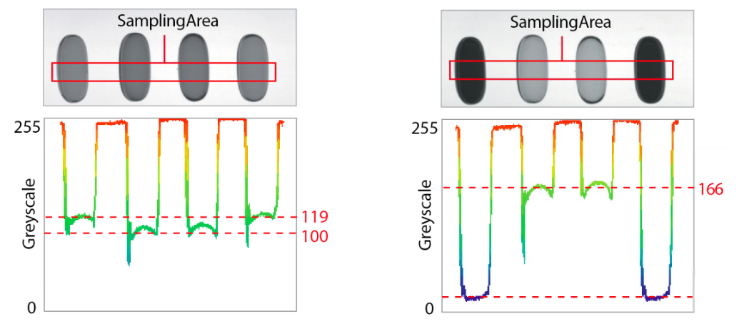 這是(shi)一(yi)種分(fen)揀應(ying)用程序,藥丸需要按(an)顏(yan)色(se)分(fen)開(kai)才能到達各自(zi)的(de)(de)位置。用單色(se)相機對(dui)膠(jiao)囊進行成(cheng)像(xiang)(圖(tu)6),綠色(se)和紅色(se)膠(jiao)囊之(zhi)(zhi)間的(de)(de)對(dui)比度(du)僅為8.7%,低于20%的(de)(de)最小建(jian)(jian)議對(dui)比度(du)。在這個(ge)特定的(de)(de)例子中,環境光(guang)(guang)(guang)的(de)(de)微小波動,例如(ru)個(ge)人走(zou)過系(xi)(xi)統,可(ke)以(yi)(yi)將已經很低的(de)(de)8.7%的(de)(de)對(dui)比度(du)值降(jiang)低到足以(yi)(yi)使(shi)系(xi)(xi)統不再能夠正常(chang)操作的(de)(de)程度(du)。這個(ge)問(wen)題(ti)有幾種解決方案:可(ke)以(yi)(yi)建(jian)(jian)造一(yi)個(ge)體積龐大、成(cheng)本高昂的(de)(de)擋光(guang)(guang)(guang)系(xi)(xi)統來(lai)完全封閉檢查系(xi)(xi)統,可(ke)以(yi)(yi)重新設計系(xi)(xi)統的(de)(de)整個(ge)照明(ming)方案,或(huo)者可(ke)以(yi)(yi)添加一(yi)個(ge)濾光(guang)(guang)(guang)片(pian)來(lai)增強綠色(se)和紅色(se)藥丸之(zhi)(zhi)間的(de)(de)對(dui)比度(du)。在這種情況下,最簡單和最具(ju)成(cheng)本效益的(de)(de)解決方案是(shi)使(shi)用綠色(se)玻璃濾光(guang)(guang)(guang)片(pian),以(yi)(yi)提高兩種不同顏(yan)色(se)膠(jiao)囊之(zhi)(zhi)間的(de)(de)對(dui)比度(du)。如(ru)圖(tu)6所(suo)示(shi),對(dui)比度(du)從(cong)8.7%提高到86.5%:幾乎增加了10倍。