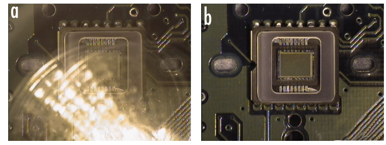 圖7:無濾鏡(jing)(jing)拍攝的圖像(a)顯(xian)示(shi)高眩光(guang),有(you)偏振濾鏡(jing)(jing)(b)減少眩光(guang)。