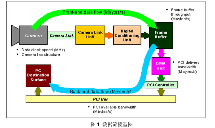 圖(tu)1所示,Front-end data flow(前端數(shu)據(ju)流)指的是相機傳送數(shu)據(ju)到圖(tu)像(xiang)采集卡內部幀緩沖存儲(chu)的視頻數(shu)據(ju)的速率。