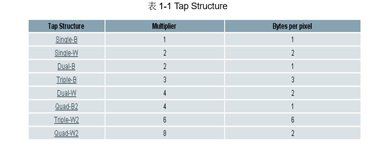 為了計(ji)算前端數據(ju)(ju)流的(de)峰值數據(ju)(ju)流量,使用相機的(de)像素時鐘(Data Clock Speed)乘以Tap(數據(ju)(ju)傳輸通道)來表(biao)示(shi),Tap 結構如下表(biao)所示(shi):