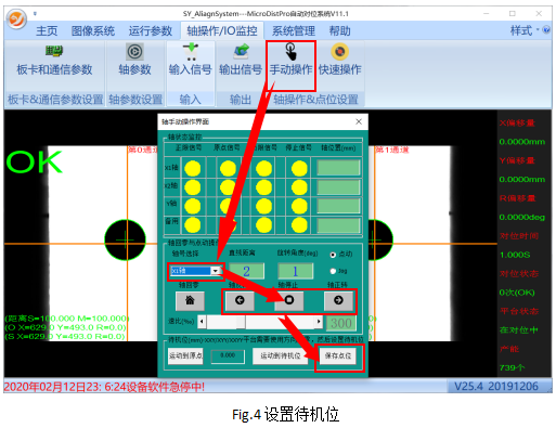 設(she)置待(dai)機(ji)位(wei)(wei)(wei)之前需要啟動(dong)復位(wei)(wei)(wei)進行平(ping)臺回零,回零完成后點(dian)(dian)擊“軸(zhou)(zhou)操(cao)作/IO監(jian)控”->“手動(dong)操(cao)作”彈出(chu)軸(zhou)(zhou)操(cao)作界面,選擇(ze)X1軸(zhou)(zhou),填寫點(dian)(dian)動(dong)距(ju)離,通過手動(dong)點(dian)(dian)擊正(zheng)反轉操(cao)控X1軸(zhou)(zhou)到(dao)限(xian)位(wei)(wei)(wei)中間位(wei)(wei)(wei)置,最后點(dian)(dian)“保存點(dian)(dian)位(wei)(wei)(wei)”。同(tong)理設(she)定(ding)X2軸(zhou)(zhou)和(he)Y軸(zhou)(zhou)的(de)待(dai)機(ji)位(wei)(wei)(wei)置,如此便完成了對(dui)位(wei)(wei)(wei)平(ping)臺待(dai)機(ji)位(wei)(wei)(wei)的(de)設(she)定(ding)。