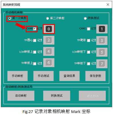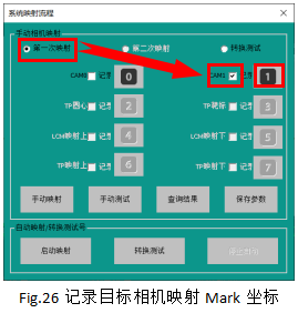 1) 系(xi)統(tong)全體(ti)停止,將帶有兩(liang)個(ge)Mark點(dian)的(de)TP搬運到(dao)目標相(xiang)機下,打開映射(she)界面,勾選第(di)一(yi)次(ci)映射(she),再勾選目標相(xiang)機CAM1,點(dian)擊記(ji)錄按鈕(niu),系(xi)統(tong)會抓取兩(liang)個(ge)Mark點(dian)的(de)坐標。