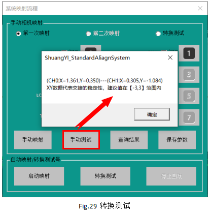 4) 重復(fu)1)、2)步驟,再搬運一(yi)次TP,抓點OK后(hou)點擊(ji)手動測試。CH數據需(xu)(xu)要(yao)在(zai)【-3~3】范圍內(nei)才算映射合(he)格。代表產(chan)品(pin)交接穩定,否則需(xu)(xu)要(yao)檢(jian)查抓點問(wen)題和(he)機構交接的穩定性問(wen)題。