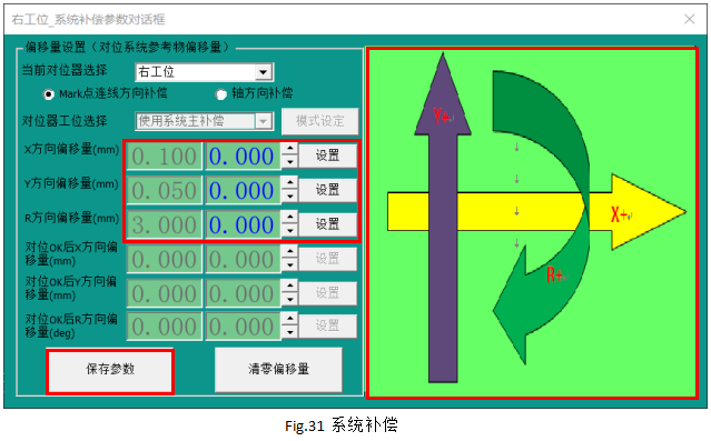 根據補償方向圖示,在右側對應的方向補償寫入補償數值后,點擊“設置”累加到左側的總補償參數中。設置完補償參數退出前(qian)必須要點擊“保(bao)存參數”,補償才能生效。
