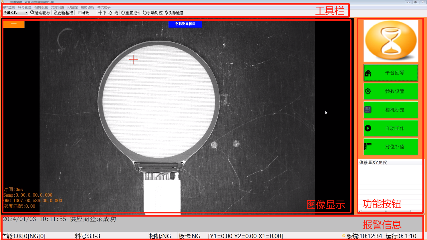首先,在雙翌對位系統的根目錄下,找到名(ming)稱為WiseAlign.exe的運行程序(xu),雙擊該應(ying)用程序(xu)圖(tu)標,進入運行程序(xu),主界面主要分4個區域(左上角:工具欄;右(you)側:功能按鈕;中間:圖(tu)像顯(xian)示;下側:報警信息)