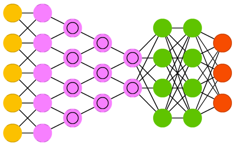 圖3顯示了CNN背后的典型設計。首先,可(ke)以使(shi)用(yong)具有多個維度的圖像(xiang)或(huo)音頻(pin)文件作為輸(shu)入(ru)(黃色圓圈)。然后將執行(xing)一系列(lie)卷積(ji)運算(suan),以便在多個層(粉(fen)色圓圈)上簡化(hua)或(huo)“卷積(ji)”輸(shu)入(ru),并將一系列(lie)卷積(ji)運算(suan)的輸(shu)出饋(kui)送(song)到神經網(wang)(wang)絡(luo)中(zhong)。根據(ju)Van Veen(綠色圓圈),分(fen)析卷積(ji)輸(shu)出的神經網(wang)(wang)絡(luo)通常是前饋(kui)神經網(wang)(wang)絡(luo)。