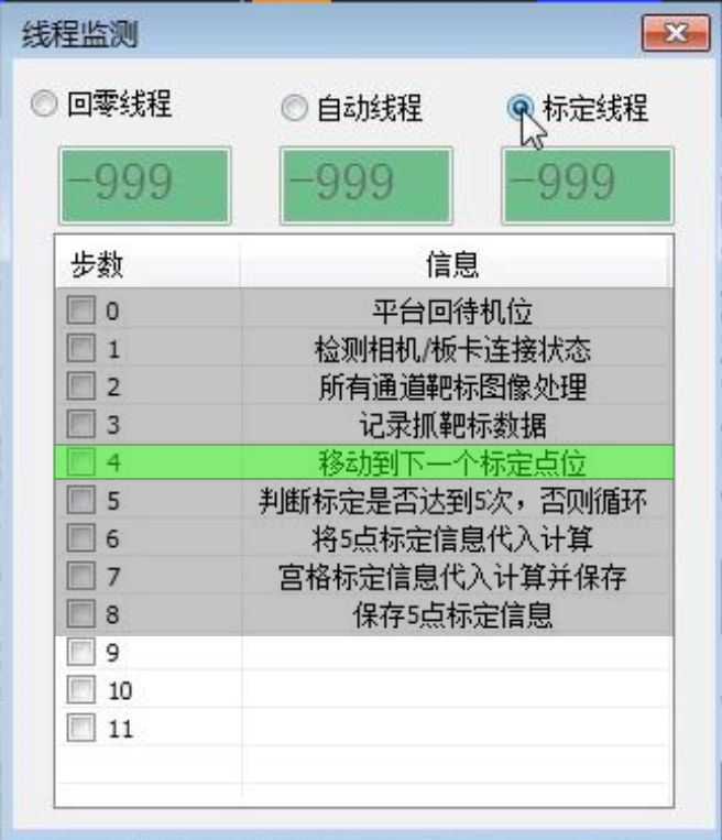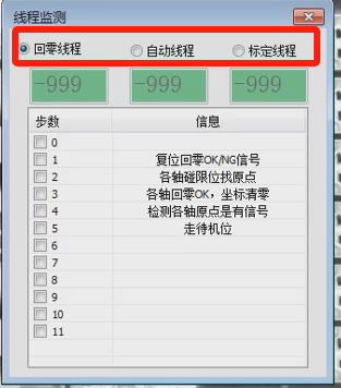 線程監測界面(mian):監控(kong)軟件當前流(liu)程的(de)執行步(bu)數狀(zhuang)態:回零、自動運行、標定三種,方便(bian)出現問題查看問題停滯(zhi)的(de)狀(zhuang)態。