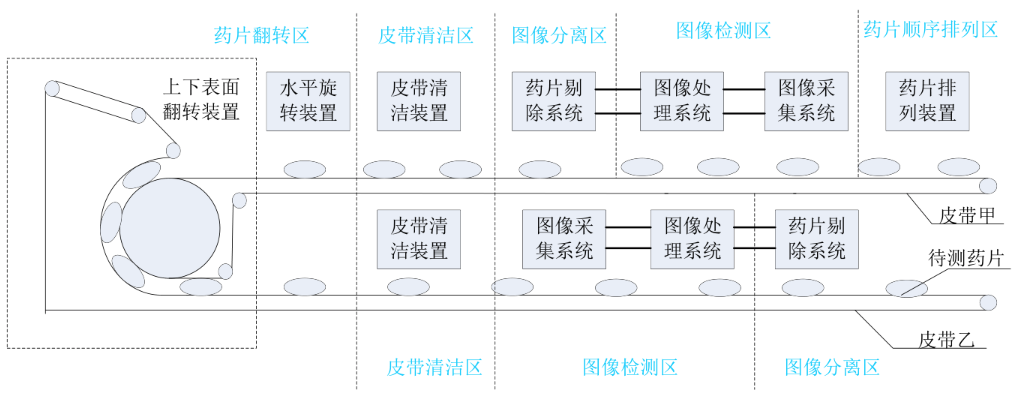如圖(tu)(tu)上(shang)圖(tu)(tu)所示,藥(yao)(yao)(yao)片(pian)(pian)(pian)(pian)(pian)(pian)(pian)(pian)(pian)在傳(chuan)送帶(dai)(dai)(dai)(dai)甲(jia)上(shang)由(you)右向左運(yun)行,首(shou)先將(jiang)待檢測的藥(yao)(yao)(yao)片(pian)(pian)(pian)(pian)(pian)(pian)(pian)(pian)(pian)裝(zhuang)(zhuang)入(ru)料斗,經過藥(yao)(yao)(yao)片(pian)(pian)(pian)(pian)(pian)(pian)(pian)(pian)(pian)排列裝(zhuang)(zhuang)置(zhi)(zhi)(zhi)將(jiang)藥(yao)(yao)(yao)片(pian)(pian)(pian)(pian)(pian)(pian)(pian)(pian)(pian)排成一列,隨皮帶(dai)(dai)(dai)(dai)甲(jia)移動;當(dang)藥(yao)(yao)(yao)片(pian)(pian)(pian)(pian)(pian)(pian)(pian)(pian)(pian)進入(ru)圖(tu)(tu)像(xiang)采集(ji)(ji)(ji)(ji)裝(zhuang)(zhuang)置(zhi)(zhi)(zhi)的視野范(fan)圍時,觸發圖(tu)(tu)像(xiang)采集(ji)(ji)(ji)(ji)裝(zhuang)(zhuang)置(zhi)(zhi)(zhi),采集(ji)(ji)(ji)(ji)藥(yao)(yao)(yao)片(pian)(pian)(pian)(pian)(pian)(pian)(pian)(pian)(pian)圖(tu)(tu)像(xiang);將(jiang)采集(ji)(ji)(ji)(ji)的藥(yao)(yao)(yao)片(pian)(pian)(pian)(pian)(pian)(pian)(pian)(pian)(pian)圖(tu)(tu)像(xiang)傳(chuan)輸到圖(tu)(tu)像(xiang)處(chu)理裝(zhuang)(zhuang)置(zhi)(zhi)(zhi),對采集(ji)(ji)(ji)(ji)的藥(yao)(yao)(yao)片(pian)(pian)(pian)(pian)(pian)(pian)(pian)(pian)(pian)圖(tu)(tu)像(xiang)進行分析處(chu)理,判(pan)別(bie)藥(yao)(yao)(yao)片(pian)(pian)(pian)(pian)(pian)(pian)(pian)(pian)(pian)是否有缺陷(xian);將(jiang)不(bu)(bu)合(he)格(ge)藥(yao)(yao)(yao)片(pian)(pian)(pian)(pian)(pian)(pian)(pian)(pian)(pian)采用(yong)剔除(chu)裝(zhuang)(zhuang)置(zhi)(zhi)(zhi)將(jiang)其分別(bie)裝(zhuang)(zhuang)入(ru)到相應的廢品收(shou)集(ji)(ji)(ji)(ji)器中;由(you)于長(chang)期傳(chuan)送藥(yao)(yao)(yao)片(pian)(pian)(pian)(pian)(pian)(pian)(pian)(pian)(pian),傳(chuan)送帶(dai)(dai)(dai)(dai)上(shang)殘(can)留太多藥(yao)(yao)(yao)片(pian)(pian)(pian)(pian)(pian)(pian)(pian)(pian)(pian)灰塵時,啟用(yong)清潔裝(zhuang)(zhuang)置(zhi)(zhi)(zhi),及時清潔傳(chuan)送帶(dai)(dai)(dai)(dai);在傳(chuan)送帶(dai)(dai)(dai)(dai)甲(jia)上(shang),僅采集(ji)(ji)(ji)(ji)到了藥(yao)(yao)(yao)片(pian)(pian)(pian)(pian)(pian)(pian)(pian)(pian)(pian)一個表面的圖(tu)(tu)像(xiang)信(xin)息(xi)(此處(chu)我們(men)稱作藥(yao)(yao)(yao)片(pian)(pian)(pian)(pian)(pian)(pian)(pian)(pian)(pian)上(shang)表面信(xin)息(xi)),通過翻滾型的藥(yao)(yao)(yao)片(pian)(pian)(pian)(pian)(pian)(pian)(pian)(pian)(pian)翻轉裝(zhuang)(zhuang)置(zhi)(zhi)(zhi),翻轉藥(yao)(yao)(yao)片(pian)(pian)(pian)(pian)(pian)(pian)(pian)(pian)(pian)的上(shang)下(xia)(xia)表面,在傳(chuan)送帶(dai)(dai)(dai)(dai)乙上(shang),采用(yong)圖(tu)(tu)像(xiang)采集(ji)(ji)(ji)(ji)裝(zhuang)(zhuang)置(zhi)(zhi)(zhi)采集(ji)(ji)(ji)(ji)藥(yao)(yao)(yao)片(pian)(pian)(pian)(pian)(pian)(pian)(pian)(pian)(pian)下(xia)(xia)表面圖(tu)(tu)像(xiang)信(xin)息(xi),然后使(shi)用(yong)圖(tu)(tu)像(xiang)處(chu)理裝(zhuang)(zhuang)置(zhi)(zhi)(zhi)分析處(chu)理藥(yao)(yao)(yao)片(pian)(pian)(pian)(pian)(pian)(pian)(pian)(pian)(pian)圖(tu)(tu)像(xiang),并(bing)及時將(jiang)不(bu)(bu)合(he)格(ge)藥(yao)(yao)(yao)片(pian)(pian)(pian)(pian)(pian)(pian)(pian)(pian)(pian)剔除(chu)。