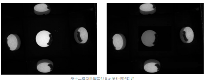 圖像灰度不均衡:藥(yao)(yao)品表面是一(yi)個曲度(du),通過(guo)反光成像獲(huo)取的邊(bian)緣藥(yao)(yao)片的光強度(du)信(xin)息較低(di),所(suo)以(yi)邊(bian)緣藥(yao)(yao)片的灰度(du)值會明顯低(di)于(yu)中心藥(yao)(yao)片的灰度(du)值。通過(guo)基于(yu)二維(wei)高斯曲面擬合(he)灰度(du)補(bu)償預處理算法,對圖像灰度(du)進行(xing)修正。