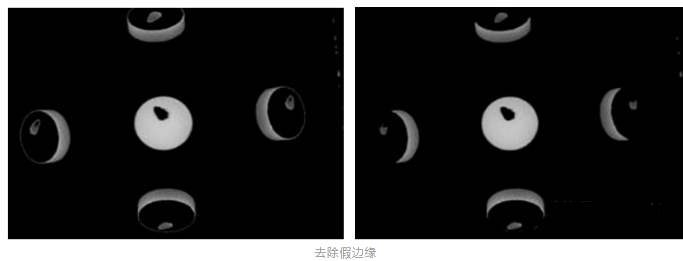 圖像邊緣修正:經過OSTU雙閾值(zhi)處(chu)(chu)理后,可以(yi)準確分離出藥(yao)(yao)片(pian)(pian)信息(xi),包括藥(yao)(yao)片(pian)(pian)上表面(mian)信息(xi)和(he)藥(yao)(yao)片(pian)(pian)側面(mian)邊(bian)緣信息(xi)。與此同時(shi),藥(yao)(yao)片(pian)(pian)圖像(xiang)的邊(bian)緣藥(yao)(yao)片(pian)(pian)處(chu)(chu)出現了假邊(bian)緣,通過形態學(xue)方法去除圖像(xiang)的假邊(bian)緣。