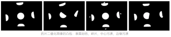 凸包(bao)(bao)(ConvexHull)是一個圖(tu)形(xing)學概(gai)念。給定二(er)維平面上的(de)點(dian)集,凸包(bao)(bao)就是將最外層的(de)點(dian)連接起(qi)來構成的(de)凸多邊形(xing),它能包(bao)(bao)含(han)點(dian)集中所有點(dian)的(de)。如下圖(tu),藥(yao)(yao)(yao)片表面劃傷圖(tu)像和(he)藥(yao)(yao)(yao)片中心污(wu)點(dian)圖(tu)像二(er)值(zhi)化后(hou)經凸包(bao)(bao)運(yun)算,其中心藥(yao)(yao)(yao)片和(he)標準藥(yao)(yao)(yao)片相(xiang)同,對于(yu)藥(yao)(yao)(yao)片碎片和(he)藥(yao)(yao)(yao)片邊緣(yuan)污(wu)點(dian)圖(tu)像,其中心藥(yao)(yao)(yao)片的(de)面積小于(yu)合格藥(yao)(yao)(yao)片。