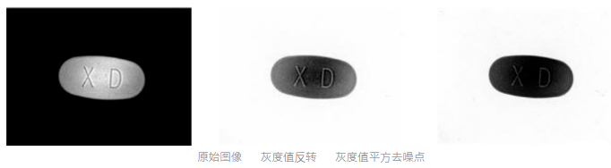 經過灰度值反轉后(hou)的(de)(de)藥(yao)片(pian)(pian)(pian)圖(tu)(tu)(tu)像(xiang),沒(mei)有去除(chu)字符周(zhou)圍(wei)的(de)(de)噪聲點(dian)(dian),本文采用平(ping)方(fang)函數(shu)(Square)對(dui)(dui)藥(yao)片(pian)(pian)(pian)圖(tu)(tu)(tu)像(xiang)進(jin)行(xing)映(ying)射,處(chu)理后(hou)的(de)(de)結果見圖(tu)(tu)(tu)C。由平(ping)方(fang)函數(shu)的(de)(de)性(xing)質決定,經過平(ping)方(fang)函數(shu)后(hou),圖(tu)(tu)(tu)像(xiang)白色(se)區(qu)(qu)域的(de)(de)對(dui)(dui)比度增(zeng)加,黑暗區(qu)(qu)域的(de)(de)對(dui)(dui)比度減(jian)少(shao)。對(dui)(dui)于藥(yao)片(pian)(pian)(pian)圖(tu)(tu)(tu)像(xiang),字符的(de)(de)特征比較明顯,藥(yao)片(pian)(pian)(pian)上的(de)(de)噪聲點(dian)(dian)減(jian)少(shao)。