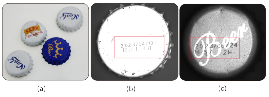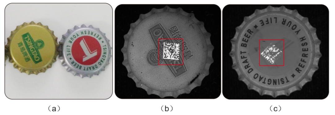 圖(tu)4:(a)被檢(jian)測瓶蓋實(shi)物圖(tu);(b)(c)采用低角度環形(xing)光源(yuan),使背景呈灰白(bai)色(se),字符圖(tu)案為灰色(se),防偽二維碼為白(bai)色(se)。