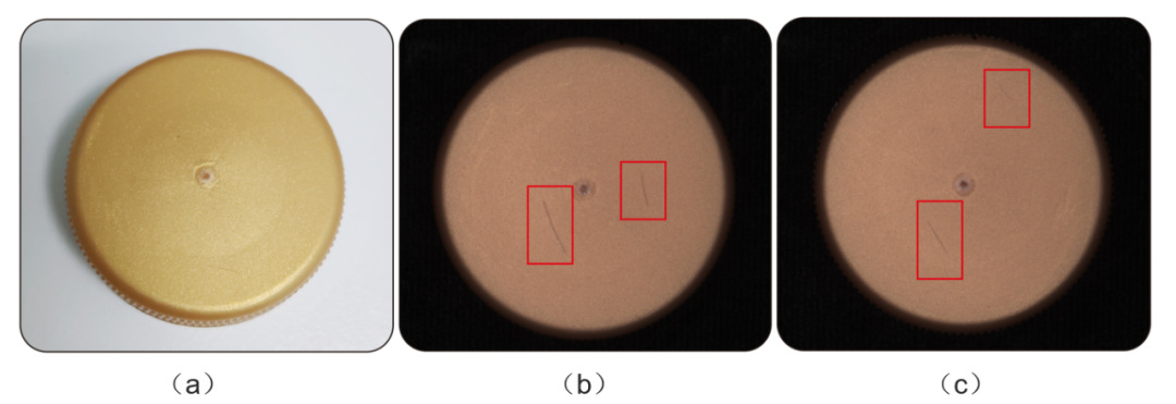 圖8:(a)被(bei)檢(jian)(jian)測瓶蓋實物圖以(yi)及(ji)(b)(c)表面劃痕缺陷檢(jian)(jian)測。