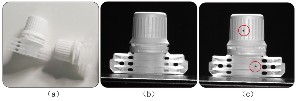 圖10:(a)被檢測吸嘴蓋(gai)實物圖以及(ji)(b)干凈無瑕疵的產品和(he)(c)有(you)臟污的產品。