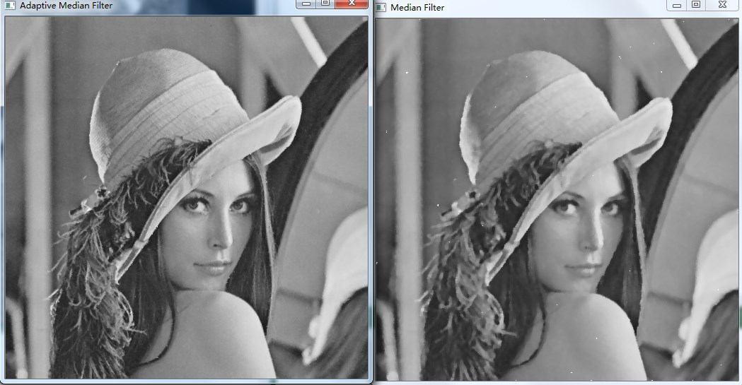 左邊是自適應中(zhong)(zhong)值(zhi)(zhi)濾(lv)波(bo)(bo)器(qi)(最(zui)小窗口(kou)為3,最(zui)大窗口(kou)為7)的(de)結(jie)果,右圖(tu)是常(chang)規中(zhong)(zhong)值(zhi)(zhi)濾(lv)波(bo)(bo)器(qi)(窗口(kou)大小為5)的(de)結(jie)果。可以看出,無論是中(zhong)(zhong)值(zhi)(zhi)濾(lv)波(bo)(bo)還(huan)是自適應的(de)中(zhong)(zhong)值(zhi)(zhi)濾(lv)波(bo)(bo),都能(neng)過(guo)濾(lv)掉圖(tu)像(xiang)中(zhong)(zhong)的(de)噪(zao)聲,自適應中(zhong)(zhong)值(zhi)(zhi)濾(lv)波(bo)(bo)器(qi)的(de)效果要好(hao)些,常(chang)規的(de)還(huan)有一些噪(zao)聲沒有過(guo)濾(lv)掉。而且(qie),常(chang)規的(de)中(zhong)(zhong)值(zhi)(zhi)濾(lv)波(bo)(bo)器(qi)對圖(tu)像(xiang)造成(cheng)的(de)模糊較明顯,而自適應中(zhong)(zhong)值(zhi)(zhi)濾(lv)波(bo)(bo)器(qi)很(hen)好(hao)的(de)的(de)保存了圖(tu)像(xiang)中(zhong)(zhong)的(de)細節。