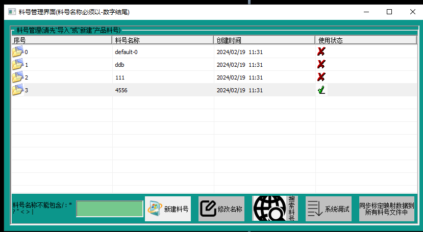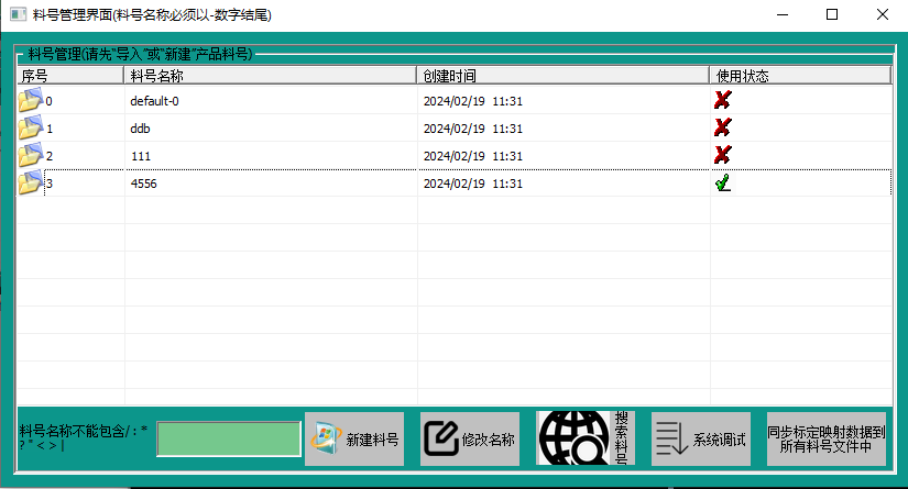 3:在(zai)框內填(tian)入需要新(xin)(xin)建(jian)的料(liao)號(hao)名(ming)(ming)(ming)稱(cheng)(cheng),后點擊“新(xin)(xin)建(jian)料(liao)號(hao)”,會創建(jian)一個新(xin)(xin)的料(liao)號(hao),并將當前使用(yong)的料(liao)號(hao)所有(you)數據復制到新(xin)(xin)料(liao)號(hao)內。點擊“修改(gai)名(ming)(ming)(ming)稱(cheng)(cheng)”會將當前選(xuan)擇(ze)的料(liao)號(hao)名(ming)(ming)(ming)稱(cheng)(cheng)改(gai)為(wei)您所填(tian)入的新(xin)(xin)料(liao)號(hao)名(ming)(ming)(ming)稱(cheng)(cheng)。