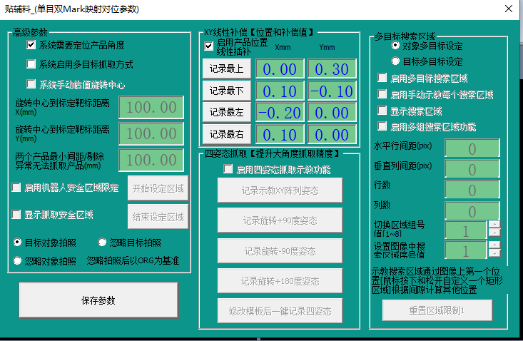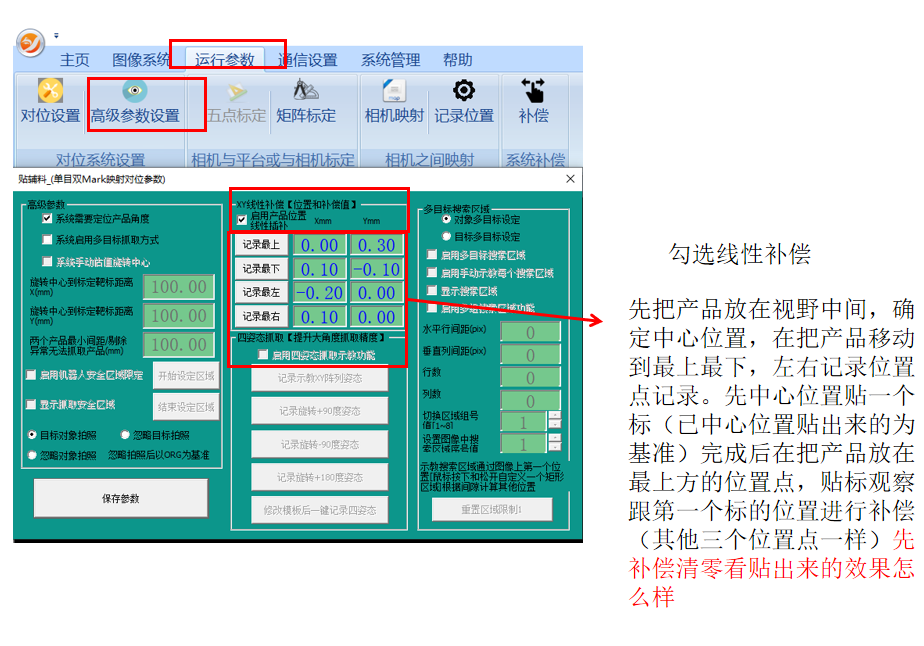 更新基準(zhun)位(wei)(wei)置是作(zuo)為(wei)對位(wei)(wei)成(cheng)功后(hou)前(qian)往貼(tie)輔料(liao)位(wei)(wei)進(jin)行補償(chang)。更新后(hou)如有貼(tie)合不(bu)對的需(xu)注意下(xia)料(liao)方(fang)向(xiang)是否正(zheng)(zheng)確,不(bu)正(zheng)(zheng)確可通過(guo)設備機械(xie)改變基準(zhun)位(wei)(wei)來調(diao)整,如補償(chang)方(fang)向(xiang)反了(le),越來越大了(le),需(xu)到“運(yun)行參數”“高(gao)級參數設置”里進(jin)行“目標X、Y對位(wei)(wei)取反”進(jin)行一個取反。