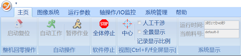 軟(ruan)件主頁包(bao)括啟動(dong)復位,自動(dong)工(gong)作,暫停作業和(he)全體停止(zhi)按鈕。