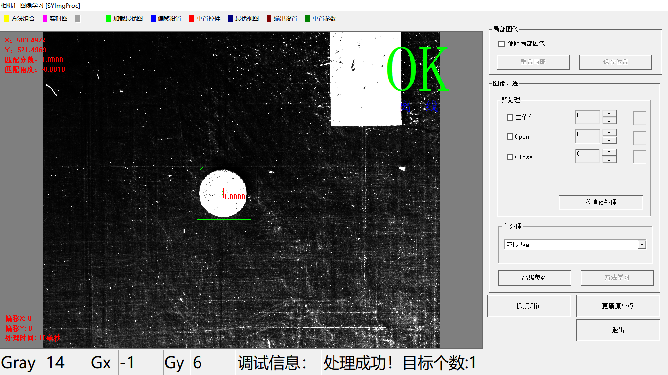 2、下拉重新選(xuan)擇“灰度匹配”,黃色的模板(ban)框(kuang)工(gong)具則會顯示出來,調整模板(ban)框(kuang)位(wei)置和大小到合適,再點(dian)擊“方(fang)法學習(xi)”,則學習(xi)記(ji)錄當前的模板(ban)。