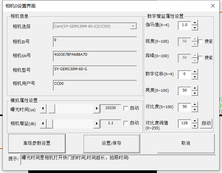 ContrastThresholdValue(0~255)對比度閾值(zhi):相機FPGA的參(can)數,默認值(zhi)是(shi)128,大于(yu)該值(zhi)是(shi)亮區(qu),小于(yu)該值(zhi)是(shi)暗(an)區(qu)!