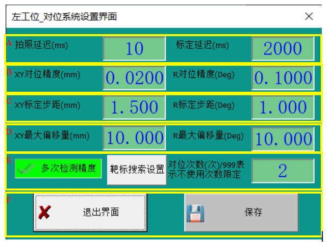 B、XY對位(wei)精度(du)(du):X方(fang)向(xiang)(xiang)/Y方(fang)向(xiang)(xiang)精度(du)(du)上(shang)限(xian),即視覺(jue)當前(qian)對位(wei)X方(fang)向(xiang)(xiang)/Y方(fang)向(xiang)(xiang)偏移量(liang)判定(ding)值(zhi)小于(yu)設定(ding)值(zhi)才會輸出對位(wei)OK;