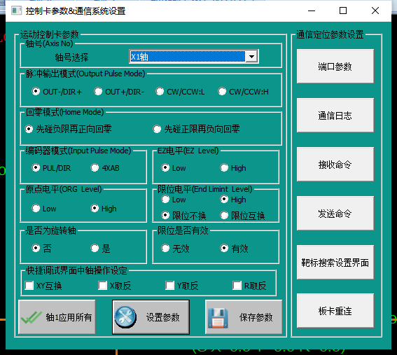 板卡和通信參(can)數(shu)包(bao)括(kuo)UVW平臺各軸的參(can)數(shu)如脈沖輸出模式、回(hui)零(ling)模式、編碼(ma)器模式、EZ電平、原點電平、限位電平等操作。