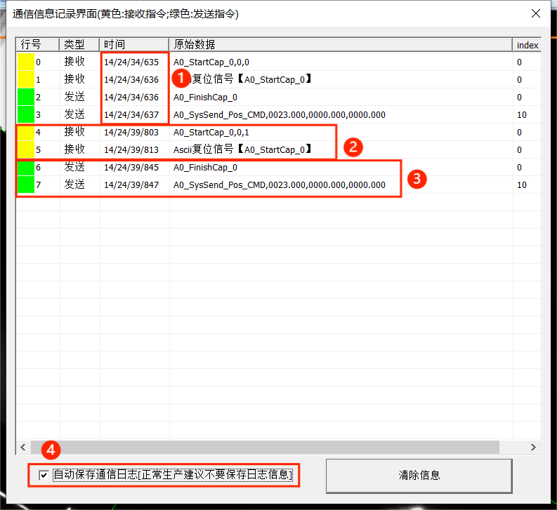①是一(yi)(yi)個(ge)流程的運行(xing)時(shi)間,由(you)機器人(ren)發信號到(dao)視覺返回信號為一(yi)(yi)個(ge)通訊流程,時(shi)間是由(you)時(shi)、分、秒(miao)、毫秒(miao)組(zu)成,例如圖中14/24/34/635 就(jiu)是14時(shi)24分34秒(miao)635毫秒(miao)